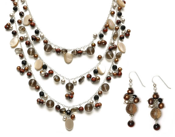 Necklace and earrings, 3 strands, semi precious stones, pearls, mother of pearl, silver. Sterling silver box clasp